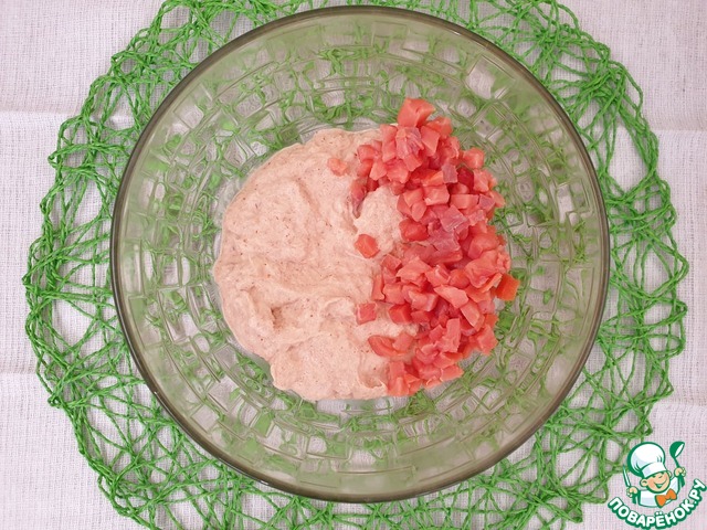 Смешиваем подготовленную массу и не крупно нарезанную семгу.