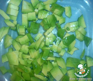Авокадо очищаем от кожуры, разрезаем пополам, удаляем косточку и нарезаем небольшими кусочками. Сбрызгиваем лимонным соком.