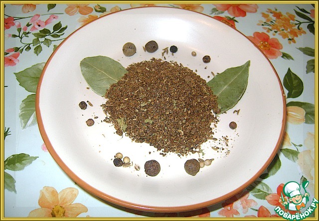 К смеси добавить душистый и чёрный перцы, гвоздику. Лавровые листы разломать на небольшие кусочки. В этот раз мы ещё добавили смесь перцев, хотя в оригинале никогда не добавляли. Поэтому, можно обойтись и без них.