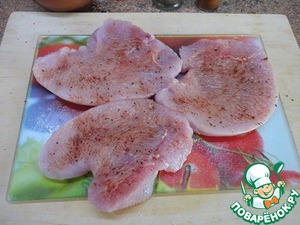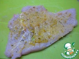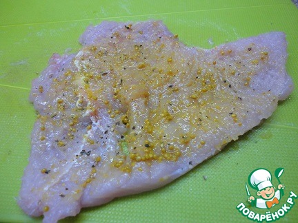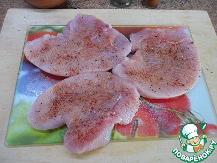 Филе птицы отбить, посолить, поперчить.
