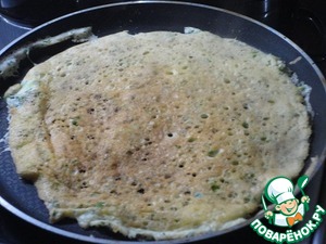 Для блинчиков слегка взбейте яйца, посолите, смешайте с мелко рубленой зеленью и выпекайте на смезанной растительным маслом сковороде. Даже блинную сковороду с антипригарным покрытием я смазывала, т. к. блинчики очень нежные, боялась порвать при переворачивании, но все обошлось. Диаметр сковороды примерно 26-27 см. Получилось два блинчика. Разрезаем их на три сегмента.
