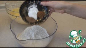 В отдельной посуде смешать все сухие ингредиенты, к просеянной муке всыпать соль, соду, корицу, мускатный орех, можно взять и другие пряности по вкусу.