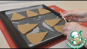 Разрезаем круг на 8 равных частей. Перекладываем заготовки на противень, застеленный пергаментом. при желании можно еще вставить в каждую ёлочку деревянную палочку, получится ёлочка на палочке) Запекаем при 180 градусах 6-8 минут.