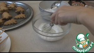 Для глазури 1 белок взобьем немного миксером, добавим лимонный сок и добавляем сахарную пудру, добиваясь нужной нам консистенции. Если хотите рисовать рисунки, делайте погуще, если просто покрыть глазурью пореже. Можно разделить глазурь и добавить пищевые красители.