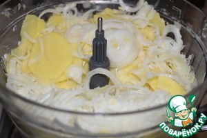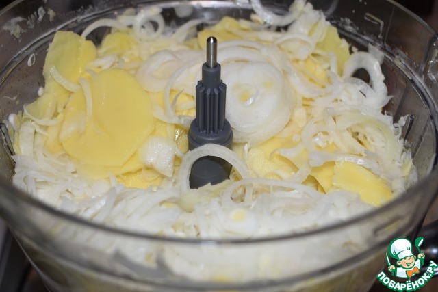 Нарезаем тонкими кружочками чищенный картофель и полукольцами лук. Мне помог Кухонный комбайн GALAXY GL2300. За считанные минуты идеально нарезанный картофель и лук.