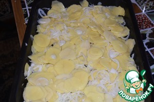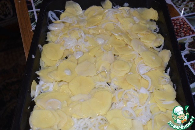 Разогреваем духовку до 180 градусов. Выкладываем картофель и лук на смазанный растительным маслом глубокий противень. Солим, перчим.