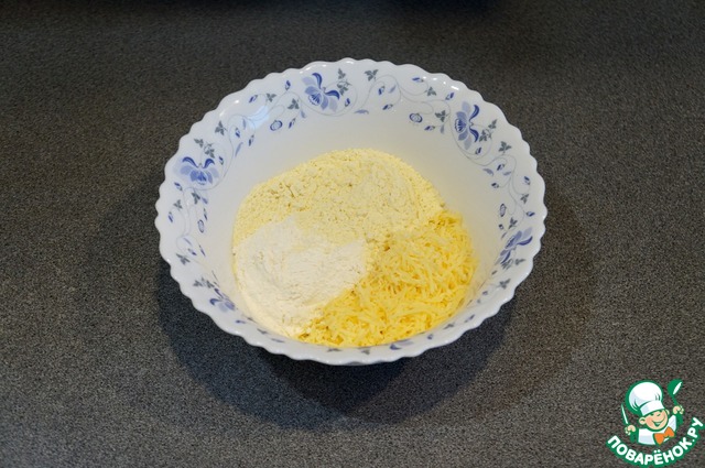 Смешайте тёртый мелко сыр, кукурузную и пшеничную муку.