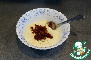 Добавьте тимьян (у меня сушёный неполная чайная ложка) и мелко нарезанные томаты. Следом мягкое сливочное масло и половину яйца. Сначала размешайте тесто ложкой, затем вымесите рукой. Уберите в пакете на 15-30 минут в холодильник.