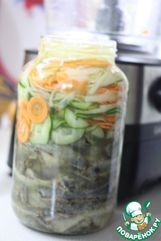 Сложить обжаренные миноги в банку, сверху уложить овощи.