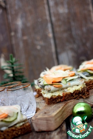Сверху- кусочки миног, а на них расположить овощи.