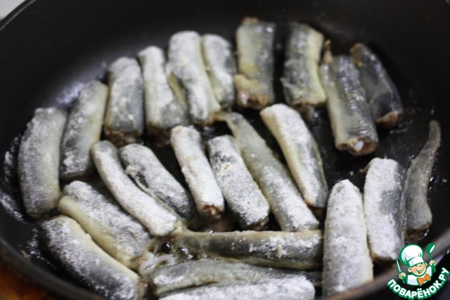 Обвалять кусочки миног и обжарить на растительном масле.