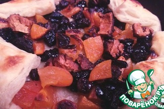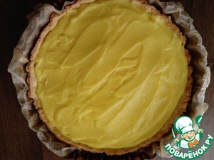 8. Достаём основу из духового шкафа убираем пергаментную бумагу с гнётом. И выкладываем подготовленную творожную начинку, разравниваем по всей поверхности. Ставим в духовку при 180 гр. ещё на 15 мин.