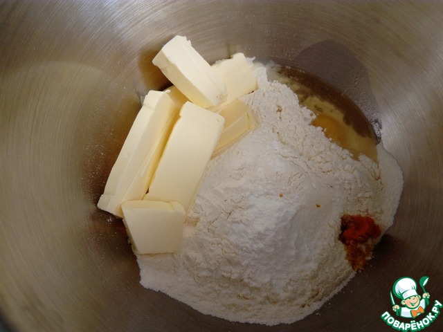- Муку (муки может уйти чуть больше или меньше), сливочное масло (масло должно быть охлажденное), яйцо, разрыхлитель, соль, цедру лимона и мандарина добавляем в чашу миксера и замешиваем тесто.