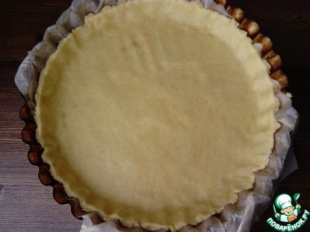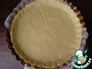2. Готовое тесто раскатываем в тонкий пласт и перекладываем в подготовленную форму (форму я застелила пергаментной бумагой и смазала растительным маслом, диаметр формы 25 см.), прижимаем тесто к краям формы, формируем бортики. Форму с тестом убираем в холодильник на 30 мин.