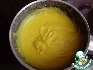- В сотейнике с толстым дном смешиваем крахмал, сахар, яйцо добавляем молоко и ставим на медленный огонь постоянно помешивая чтобы избежать образования комочков. Как только заварной крем загустеет и начнет закипать, снять с плиты. В горячий заварной крем добавить мягкое сливочное масло, лимонную цедру, краситель (жёлтый) размешать до полного растворения. Заварной крем накрыть пищевой пленкой "в контакт" и оставляем заварной крем охлаждаться при комнатной температуре. -