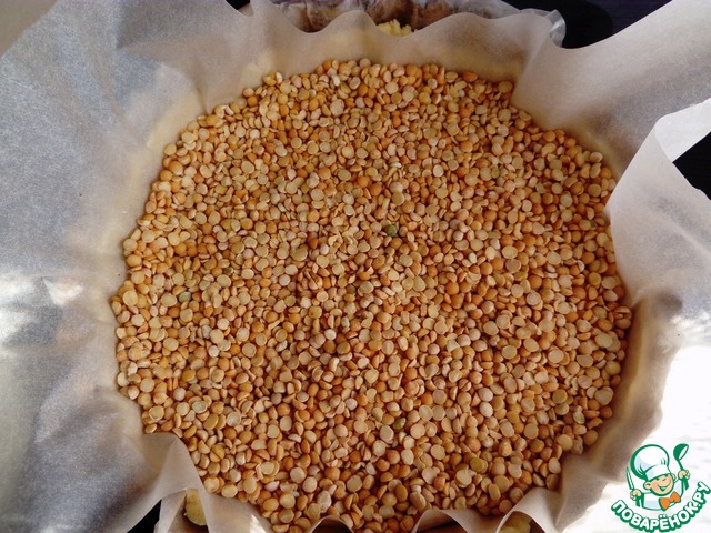 6. Накрываем заготовку пергаментной бумагой и высыпаем гнёт — это может быть пачка фасоли, гороха, орехи или специальные камни для выпечки. Ёлочки укладываем на противень. Ставим выпекаться в разогретую духовку до 180 гр. на 15-20 мин.
