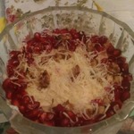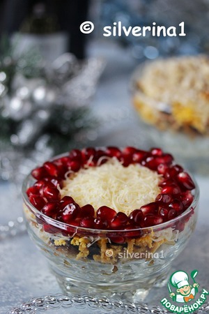 Можно украсить верх салата гранатовыми зернами, зеленью или посыпать кусочками орехов - это на ваше усмотрение.