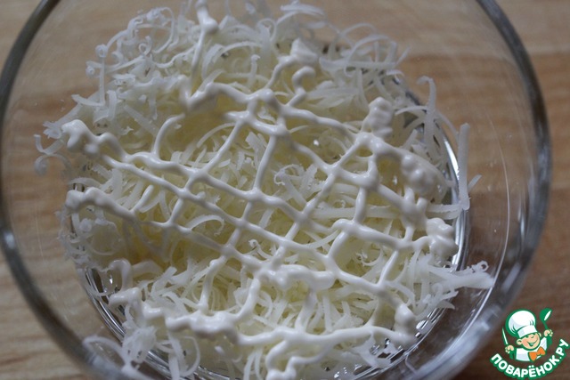 Покрыть его майонезом. На одну креманку у меня ушло примерно 0,5 столовой ложки майонеза (по четверти ложки на слой).