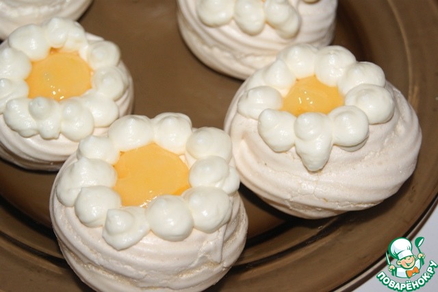 Гнезда в безе заполнить курдом. Вокруг отсадить крем (насадка труба).