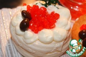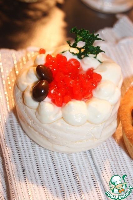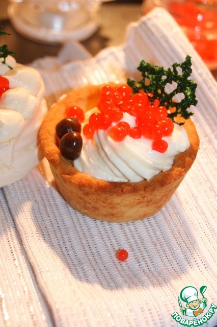 Украсить пирожные "икрой", шоколадными"маслинами" и кружевными чипсами непосредственно перед подачей на стол.