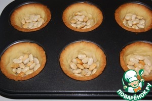 Формовать корзиночки, так как у меня с "икрой", то я их выпекала в форме для маффинов. На дно корзиночек застеленных кружочками, вырезанными из пекарской бумаги, поместить груз (у меня фасоль).