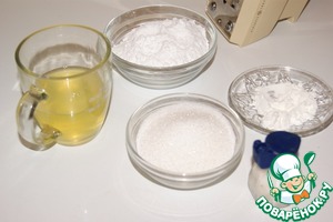 Пудру смешать с крахмалом. Ввести в белки в три приема, постоянно перемешивая лопаткой. Добавить пару капель лимонного сока и перемешать.