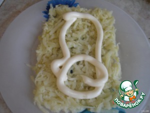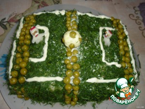 из кондитерского мешочка выдавливаем тонко майонез делая ворота и разметку поля