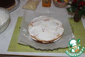 Собираем торт. Смазываем корж мандариновым джемом.