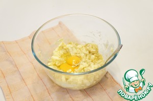 К бананам отправьте масло и два яйца. Хорошо размешайте вилкой.