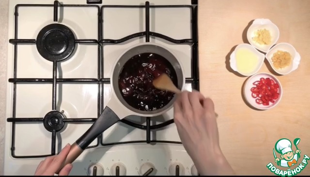 Сотейник ставим на огонь, выливаем туда соевый соус. Добавляем кетчуп и джем, перемешиваем пока соус нагревается