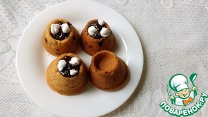 • У кексов с выемками я срезала верхушки для устойчивости. В выемки налила растопленный с молоком на водяной бане шоколад.