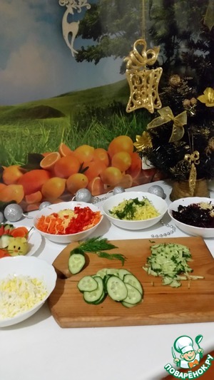 Все слои аккуратно выкладываю на блюдо слой за слоем: 1) свекольный,