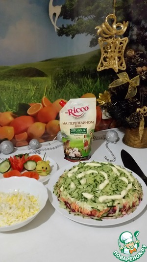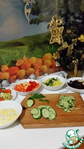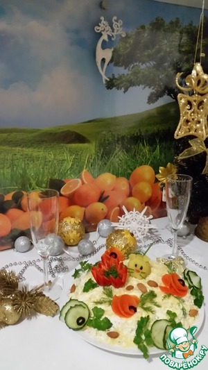 Потом выкладываю тёртые на тёрке яйца, смазываю майонезом и посыпаю оставшимся тёртым сыром. Украшаю салат вырезанными из овощей цветами и зеленью - и на праздничный стол. Приятного аппетита и с наступающим Новым годом! Пусть наступивший год принесет Вам и Вашим семьям больше добра и радости!