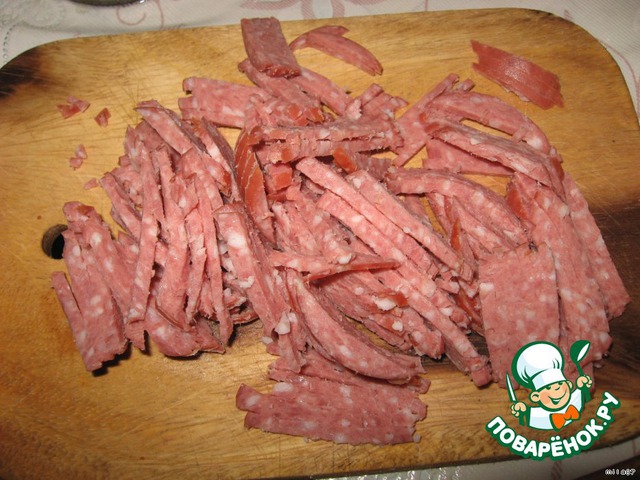 Салатик из стеклянной лапши... которая как губка впитывает в себя все окружающие вкусы и ароматы... Простое сочетание копченной колбаски, свеженького хрустящего огурчика, обжаренных лука и моркови... и безвкусная серенькая лапшичка, пропитавшись, превращается во вкусный ужин или обед...