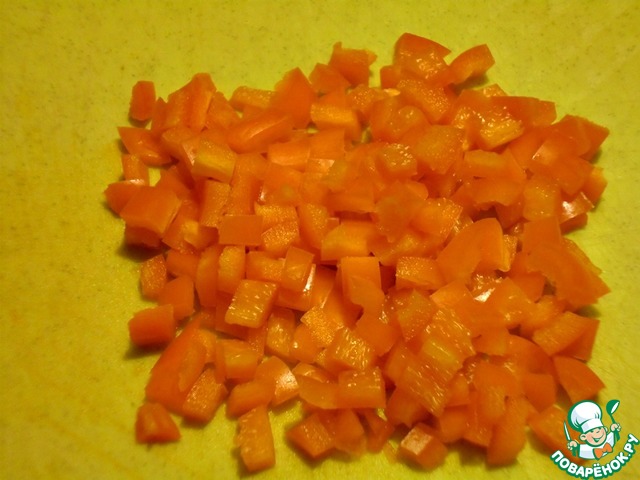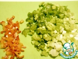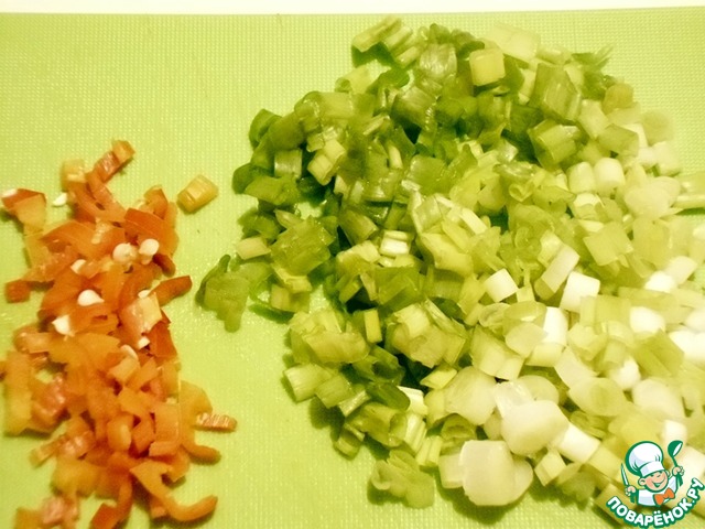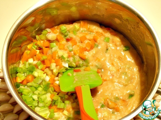 • Всыпать подготовленные лук и оба перца. Варить 10 минут на слабом огне, постоянно помешивать лопаточкой, чтобы смесь не пригорела и не образовались комочки.