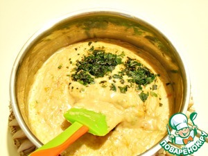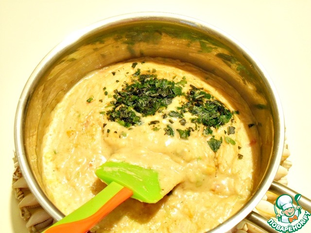 • Перед окончанием добавить растительное масло, мелко молотые орехи, зелень, паприку и соль. Если всё же комочки образовались, можно смесь протереть картофельной толкушкой с дырочками.