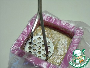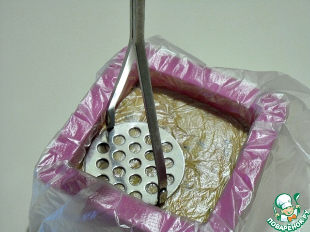 • Остывшую массу накрыть пленкой, картофельной же толкушкой утрамбовать плотно и убрать в холодильник для "созревания сыра" на 6 - 7 часов.