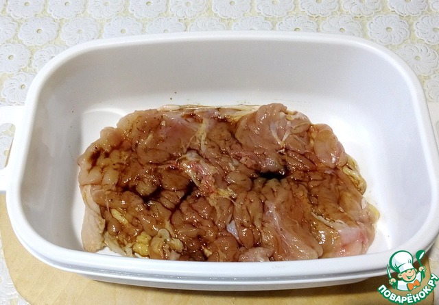 Сложить мясо в контейнер, полить на каждый кусочек по чайной ложке соевого соуса. Накрыть и в холодильник, на 20-30 минут, но можно хоть и на ночь.