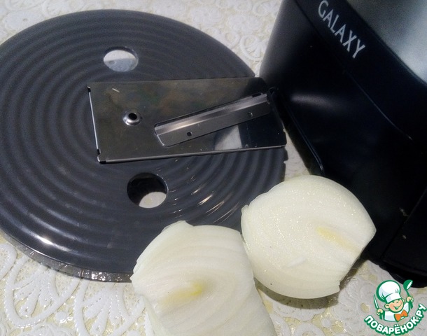 Приготовить начинку. Лук нашинковать при помощи комбайна GALAXY соломкой, насадкой для шинковки.