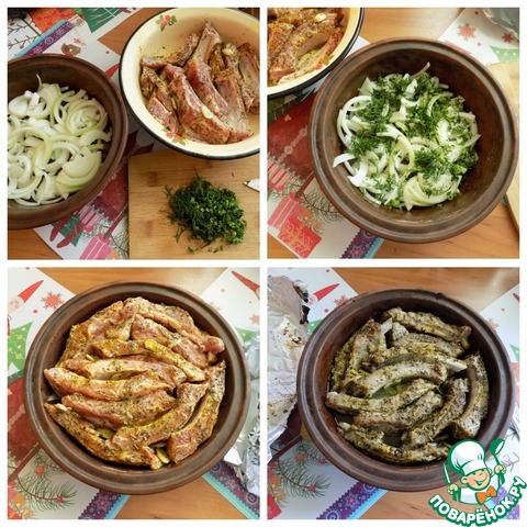 Утром достала рёбра. Приготовила глиняную сковороду D-24 см и высотой-5 см. Обмазала её маслом и на низ выложила порезанную полу-кольцами большую луковицу. Порубила мелко укроп и посыпала им лук. На эту "подушку" выложила замаринованные рёбра. Поместила все. Их нарезанных у меня получилось 11 шт. Накрыла сковороду фольгой и поставила в духовку при т-200 С на один час. Через час вынула сковороду, удалила фольгу. Рёбра дали сок. Поставила опять в духовку при той же температуре на 30 минут, чтобы рёбра красиво запеклись.