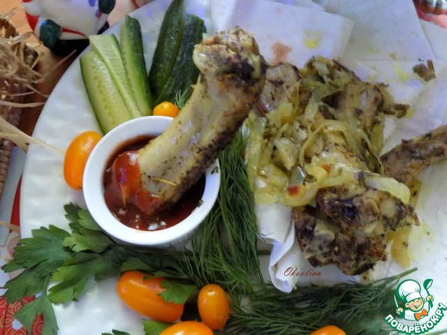Я буду их подавать каждому индивидуально. На большую тарелку выложу разрезанный лаваш, положу зелень, помидоры-черри и порезанные огурцы. Поставлю в тарелку соус в маленькой соуснице. На лаваш выложу рёбрышки и сверху - лук. Какой аромат!