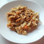 Нарезаем полвилка капусты (не крупный вилок :)), добавляем в сковороду, подливаем немного воды (2-3 столовые ложки будет достаточно) и ставим тушиться на медленный огонь.