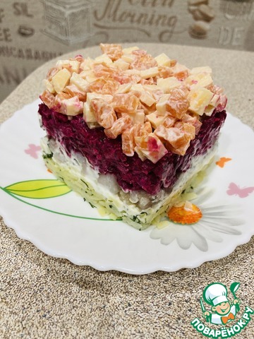 Вкус домашнего салата “Селедка под шубой” или просто “Шуба” знаком каждому с малых лет. Он любим всеми и состоит из простых доступных ингредиентов, что делает его весьма популярным блюдом на праздничном столе. Хочу предложить новую интерпретацию любимого салата. Этот рецепт – хорошая альтернатива салату "Селедка под шубой". Вкусно и красиво. Салат получается красивым и нарядным, он украсит любой праздничный стол. А вкус нежный и сочный.