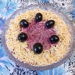 На подготовленное блюдо ставим разъемную форму (у меня 21 см в диаметре). Первым слоем выкладываем картофель с укропом и разравниваем, затем порезанную селедку, свеклу с чесноком и сверху морковь с сыром. Украшаем салат по желанию. Я украсила маслинами и веточками укропа.