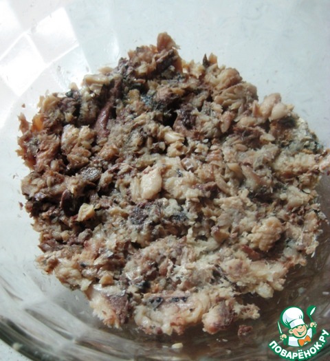Сардину вынуть из банки, разделить на кусочки и чуть размять вилкой.