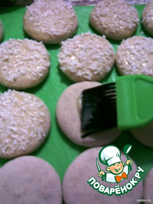 На остывшие кружочки кисточкой нанести белую глазурь и посыпать белой кокосовой стружкой