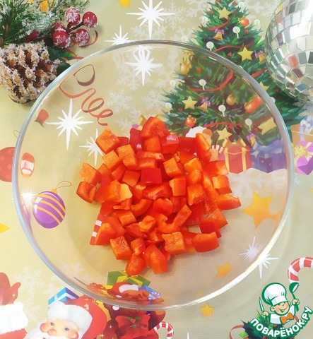 Перец нарезать кубиками и выложить в большую чашу для удобства.