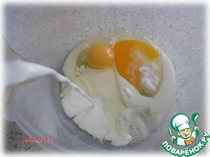 2 яйца смешать с 0,5 ч. л. соды, 1 ч. л. соли и 1 щепот. сахара. Добавить 250 мл тёплого молока и тщательно размешать до однородности.