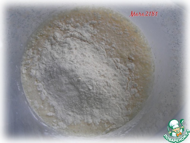 400 г муки просеять и постепенно добавить к молочно-яичной смеси.