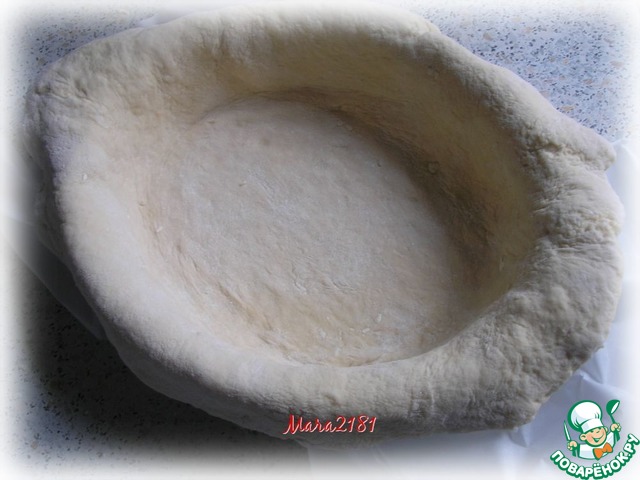 Подготовить подходящую форму с толстым дном, предварительно застелив её пергаментной бумагой. Раскатать тесто толщиной около 7-8 мм исходя из размеров необходимой формы и аккуратно переложить в форму. Лишние края пока не обрезать!